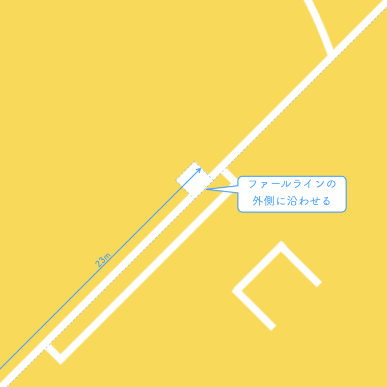 ベースコーチが立つ範囲をしめすコの字型のエリア。サイズは、2.54m × 5.144mです。ベースの位置を基準にファールラインから3m離します。