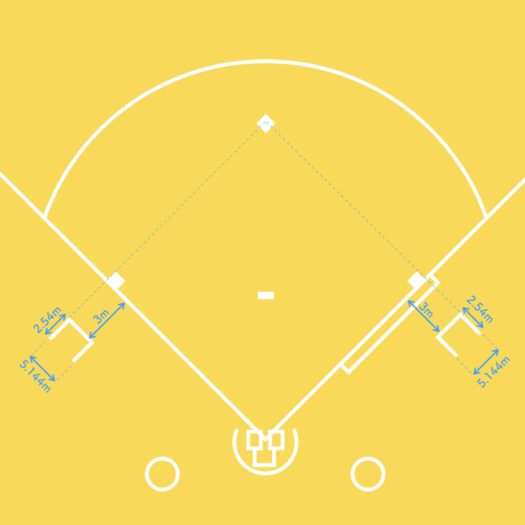コーチスボックスは、ランナーコーチが位置取りをするためのエリアです。ファールラインから3m離れた場所幅2.54m × 長さ5.144mの”コの字型”を描きます。