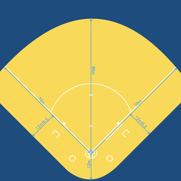 ホームベースの位置が決まると、次に確認したいのが 外野の広さ。少年軟式では次の目安があります。