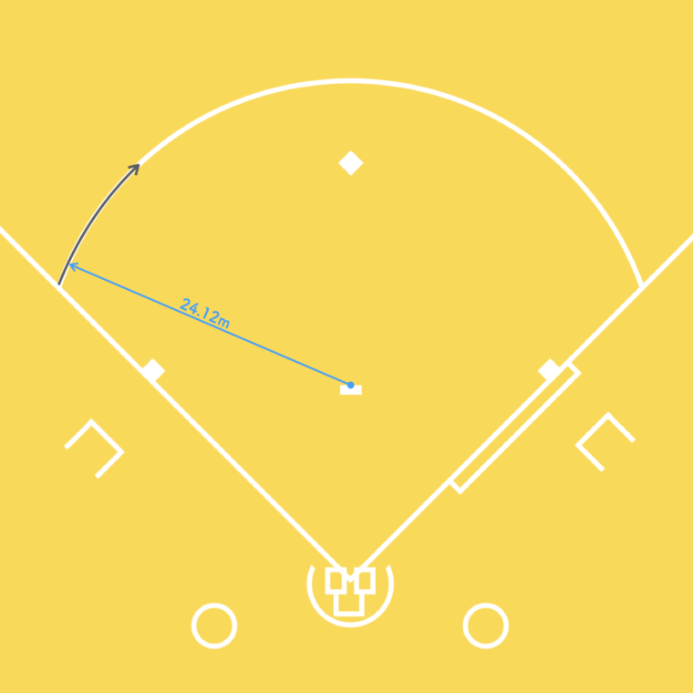 インフィールドラインの半径は 24.12m投手板の真ん中(二塁側)からメジャーや紐を24.12mまで伸ばし、コンパスのように弧を描きます。