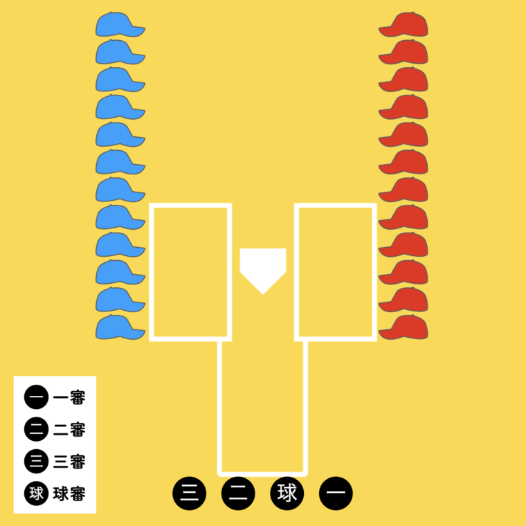 審判員の並び順は、一塁審が一塁ベース側、三塁審が三塁ベース側です。球審は一塁審の隣、三塁審の隣は三塁審が並びます。