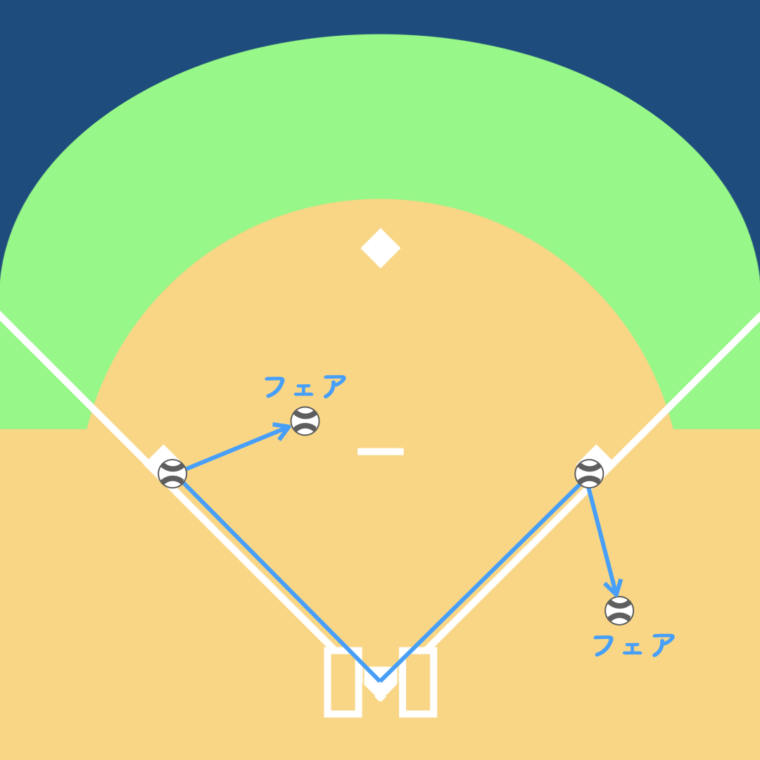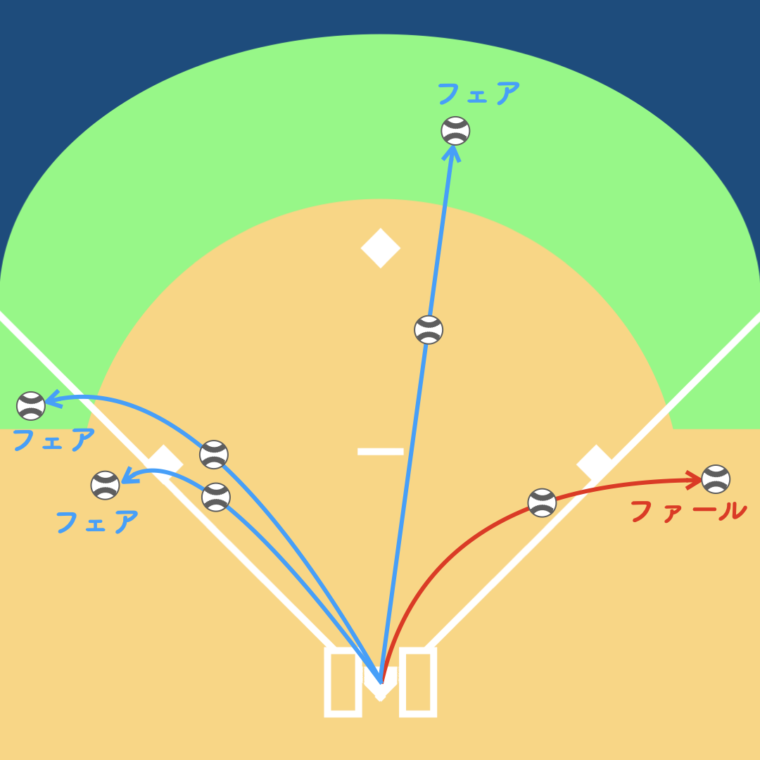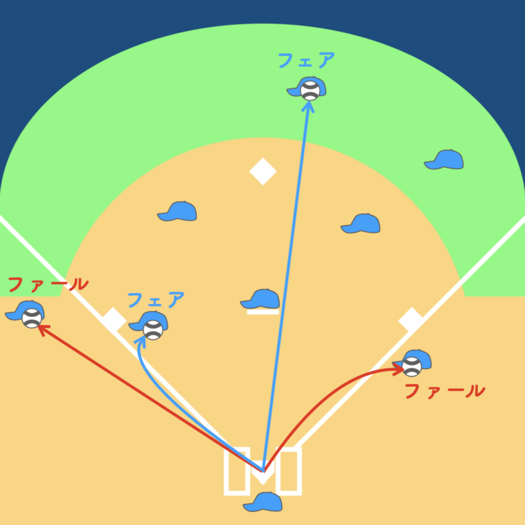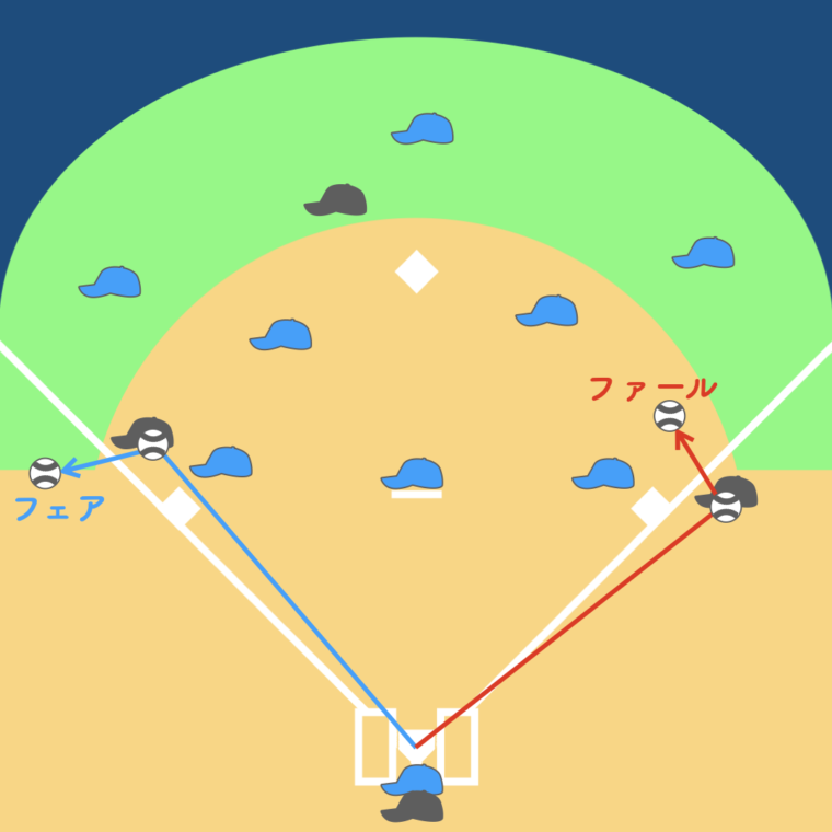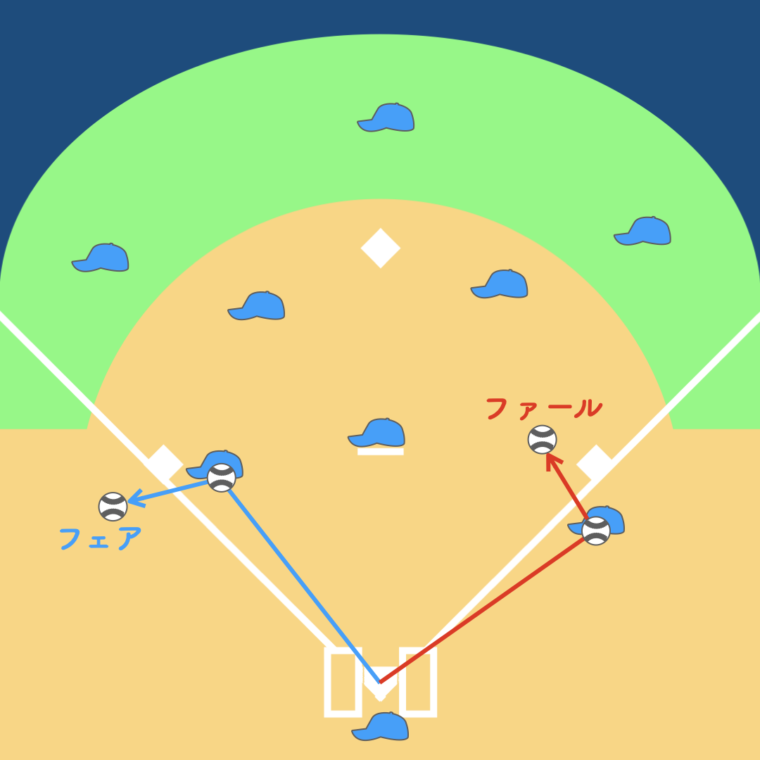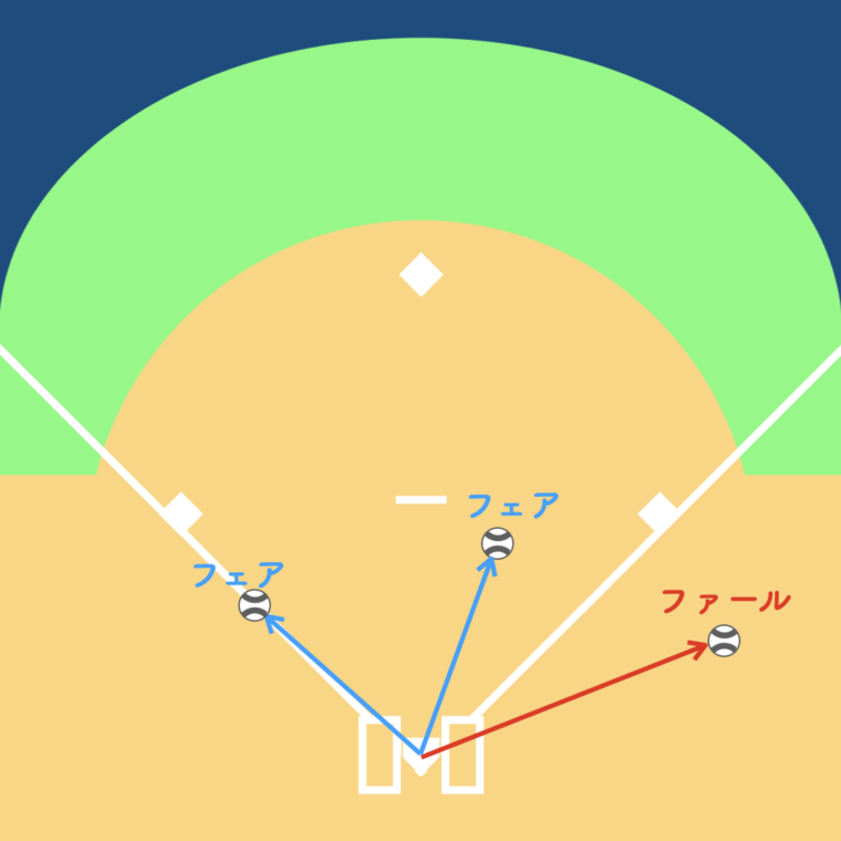 フェアゾーンに飛んだ打球が「フェア」、ファールゾーンに飛んだ打球が「ファール」と覚えるのが基本です。