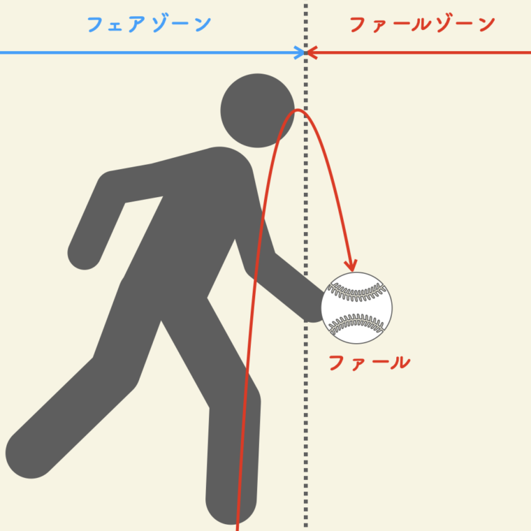 フェアゾーンの打球を捕球できず、ファールゾーンに転がっても「フェア」。逆にファールゾーンの打球を捕球できず、フェアゾーンに転がっても「ファール」です。