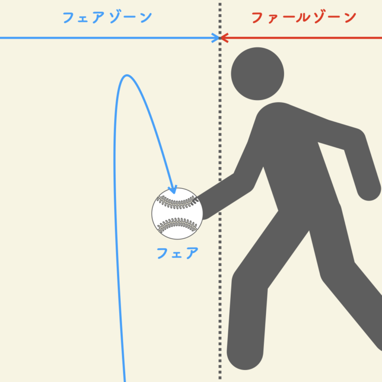 反対に野手の体がファールゾーンにあっても、捕球されたボールの位置がフェアゾーンなら「フェア」となります。