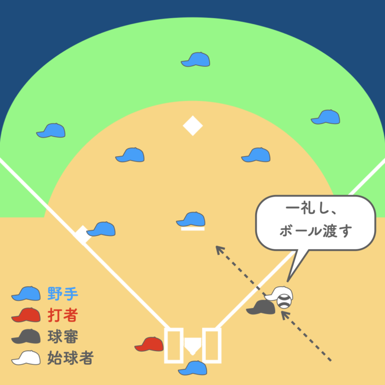 - 一塁側ファールライン手前で一礼し、ボールを手渡し