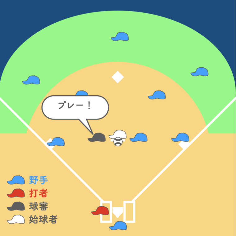始球者・球審・投手の立ち位置が整い、始球者の準備ができたら、始球式のはじまり。球審は、その場で「プレー!」とコールしましょう。