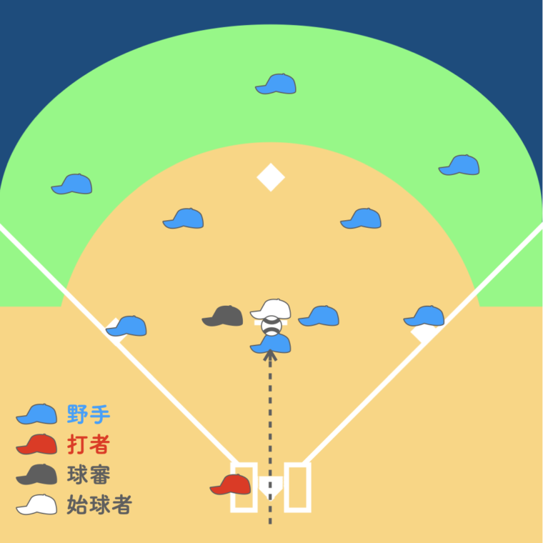 球審は、始球者の後ろ側を通り、始球者の三塁側の隣へ移動します。そのまま、始球者の投球の準備が整うのを待ちましょう。