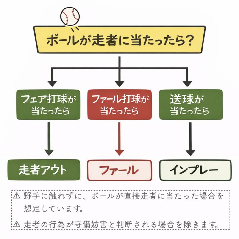 野手の送球が走者に当たった場合、フェアゾーンかファールゾーンかを問わず、原則として走者はアウトになりません。ボールはインプレーとして扱われ、プレーはそのまま継続されます。