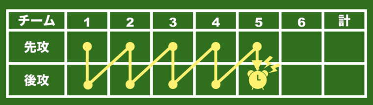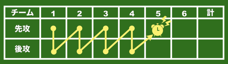 5回オモテの攻撃中に時間到達場合、この時点ではまだ5回ウラの後攻の攻撃が残っています。