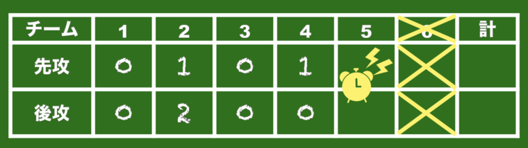 この時点では同点のため、試合は5回ウラの攻撃まで続行。先攻めチームが勝ち越しても、5回ウラの攻撃まで続行です。