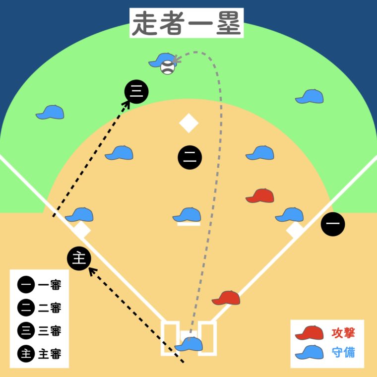 三塁審判が打球を追うため、三塁走者の帰塁は主審、一塁走者の帰塁は一塁審判が担当します。二塁審判は空いた塁のプレーをカバーするように動きます。