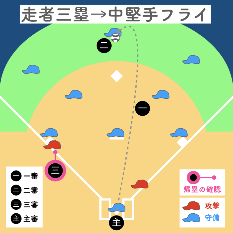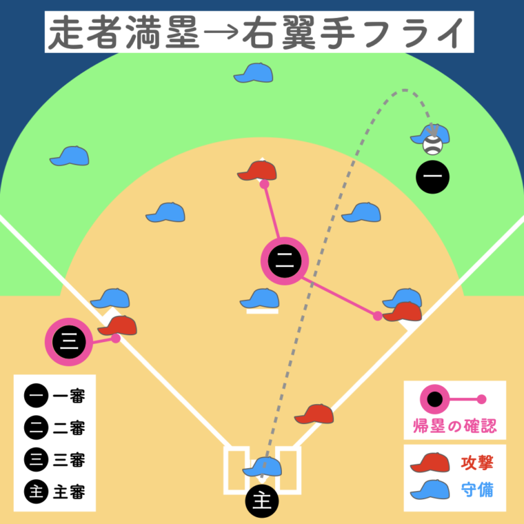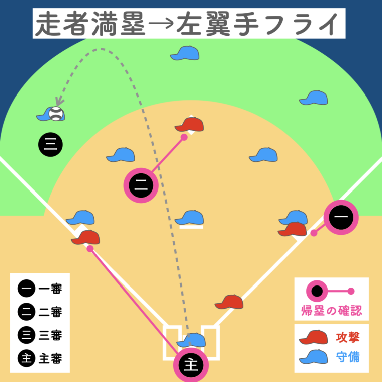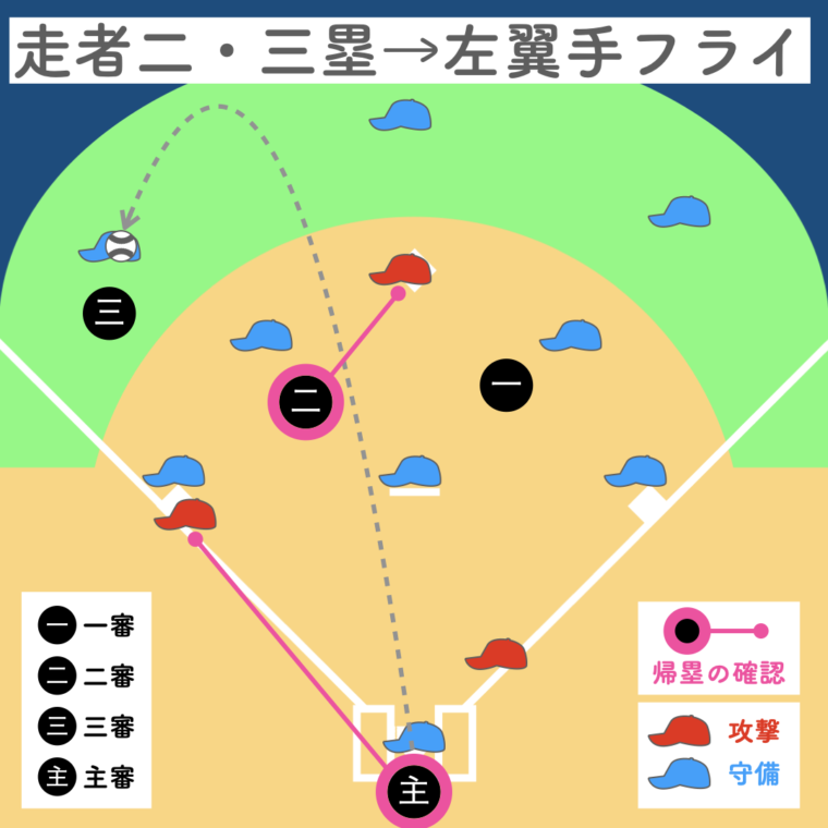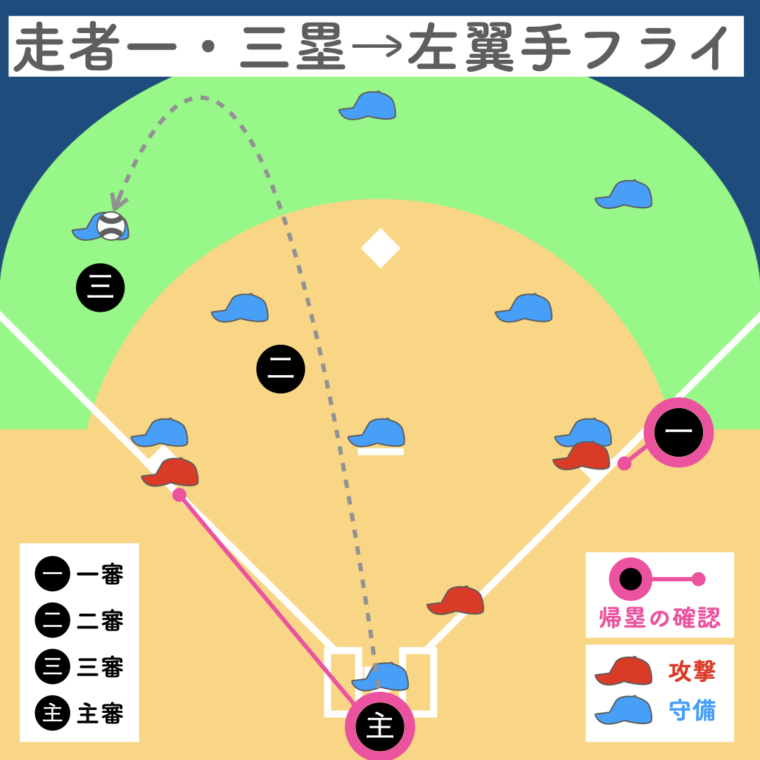 一塁審判が打球を追うため、三塁走者の帰塁は三塁審判、二塁走者の帰塁は二塁審判が確認。主審は本塁のプレーに備えます。