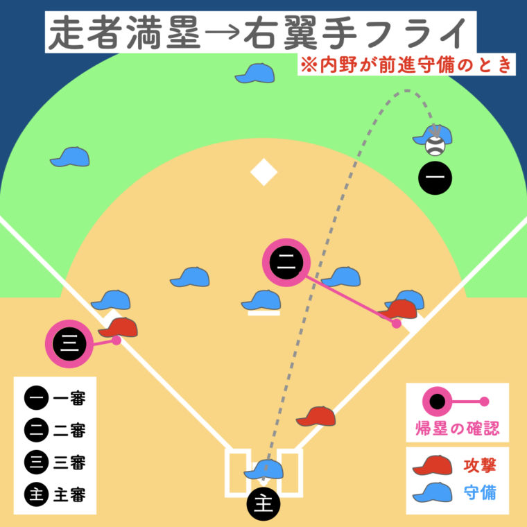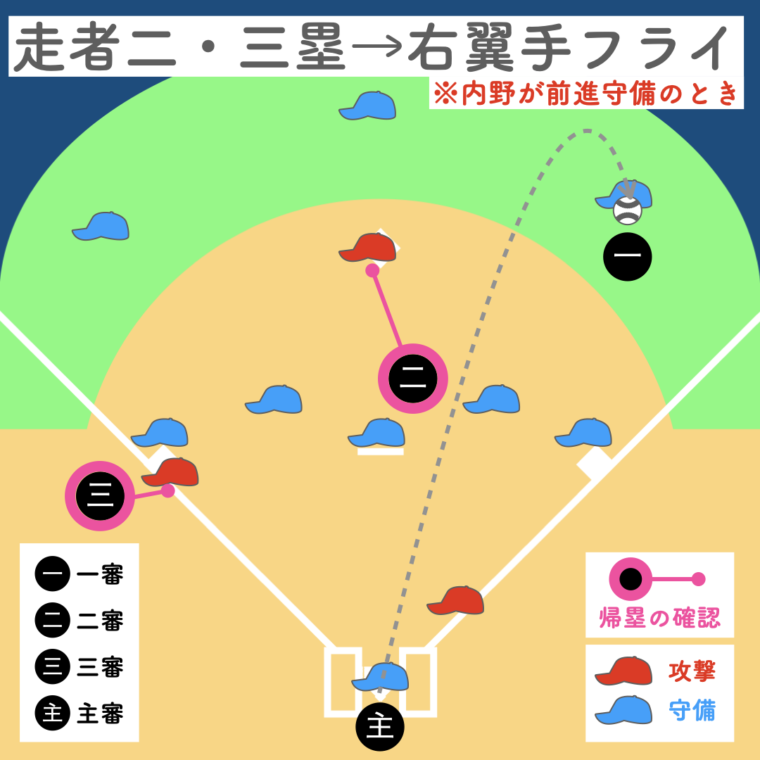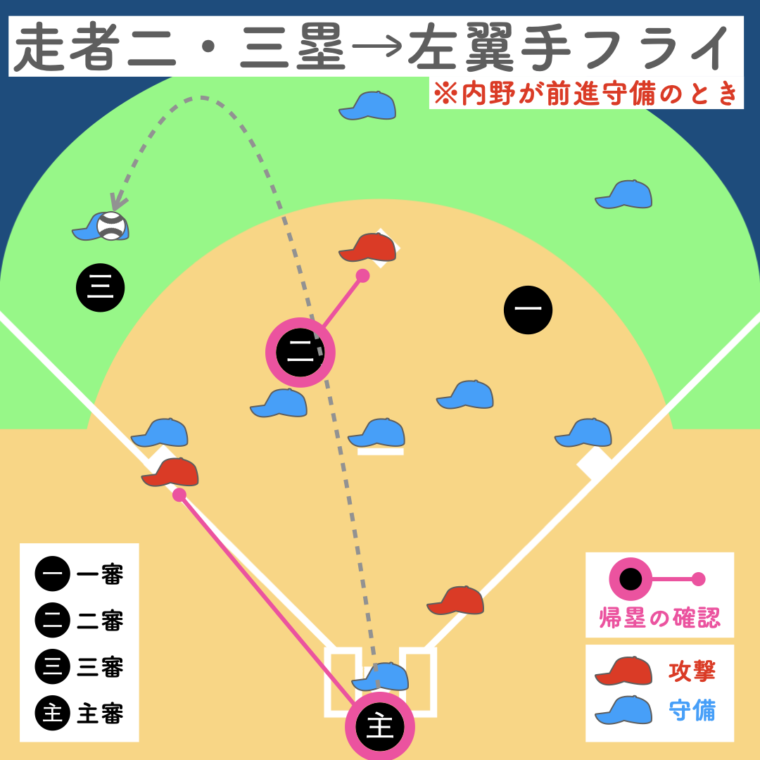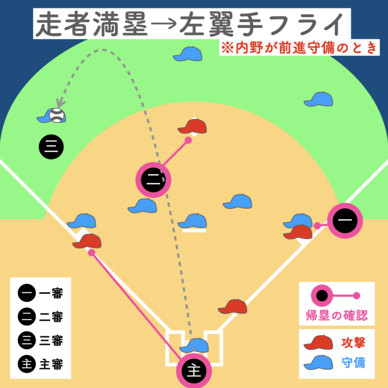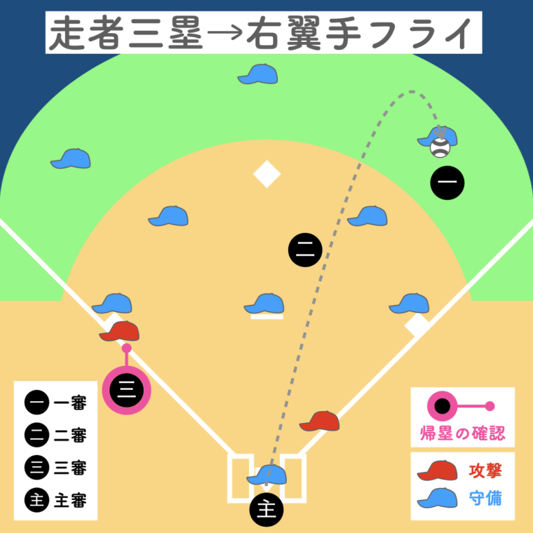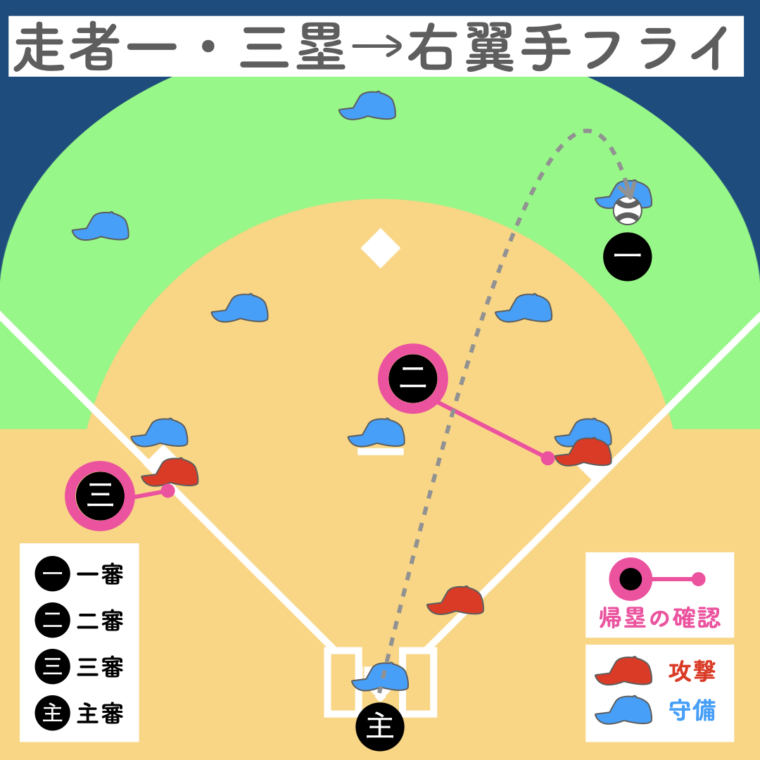 一塁審判が打球を追うため、三塁走者の帰塁は三塁審判、二塁走者の帰塁は二塁審判が確認。主審は本塁のプレーに備えます。