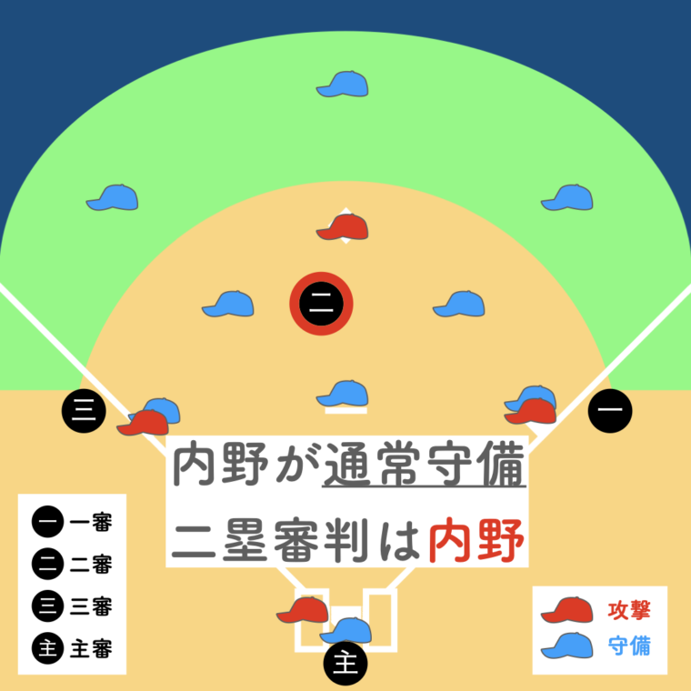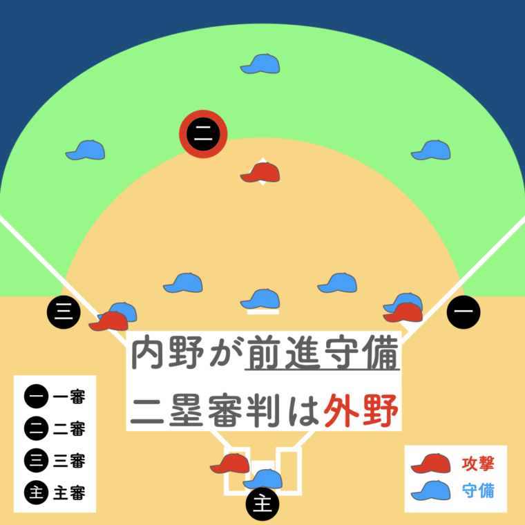 - 内野前進守備では 二塁審判の位置が外側になり役割が変化する