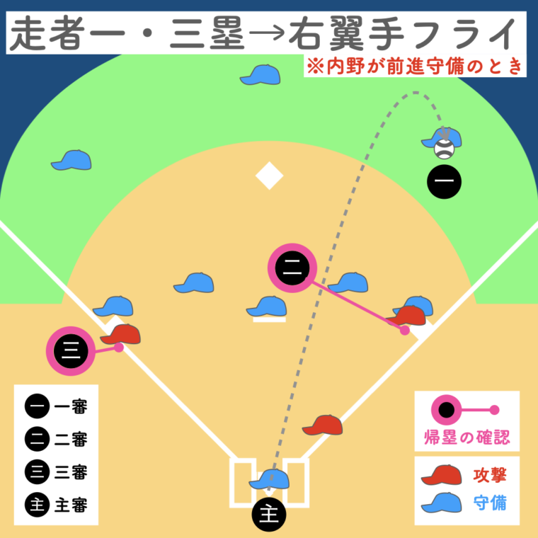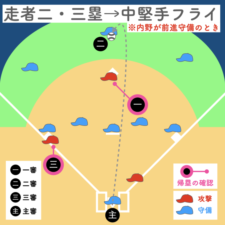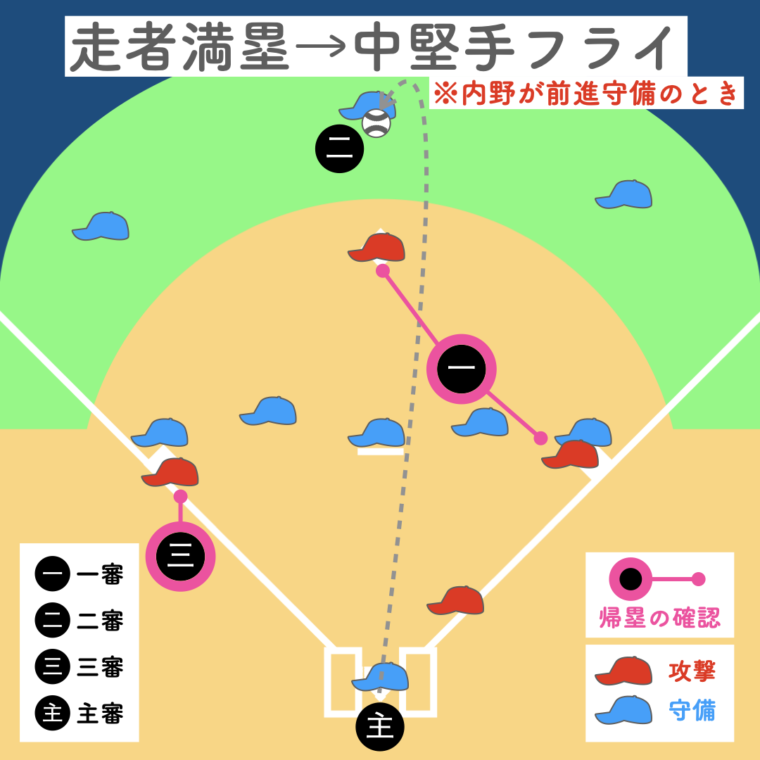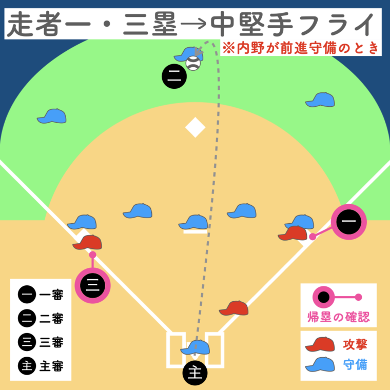 二塁審判が打球を追うため、三塁走者の帰塁は三塁審判、一塁走者の帰塁は一塁審判が確認します。主審は本塁、二塁審判は空いた塁のプレーに備えます。