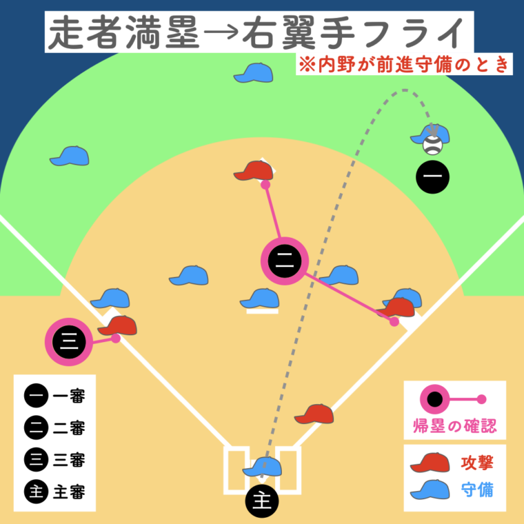 一塁審判が打球を追うため、三塁走者の帰塁を三塁審判、二塁走者の帰塁は二塁審判が確認します。主審は本塁のプレーに備えます。